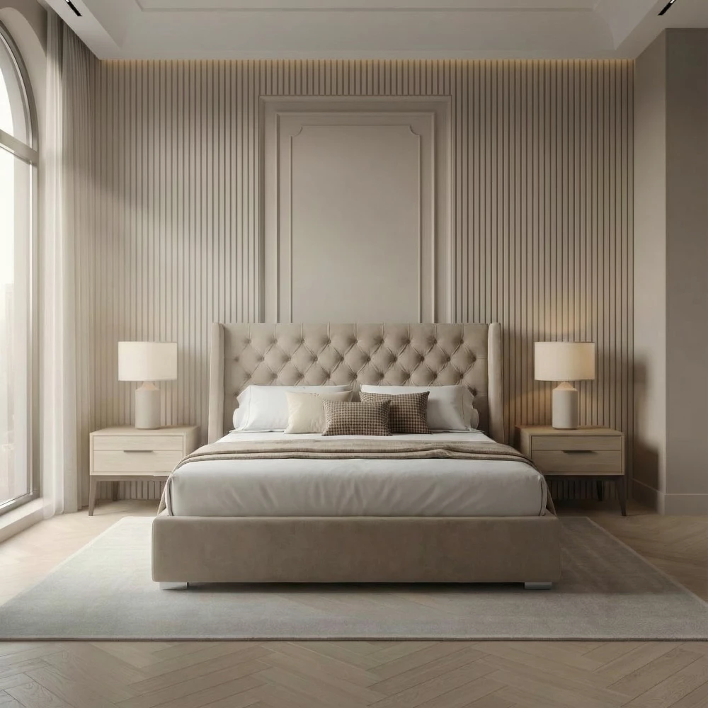 The Classic Wingback Bed combines timeless elegance with contemporary design, featuring a tall Chesterfield-style upholstered headboard framed by sleek winged sides. Crafted from a solid wood frame and available in a wide range of premium fabrics, this bed creates a striking focal point in any bedroom, with the option of practical ottoman storage for added functionality.