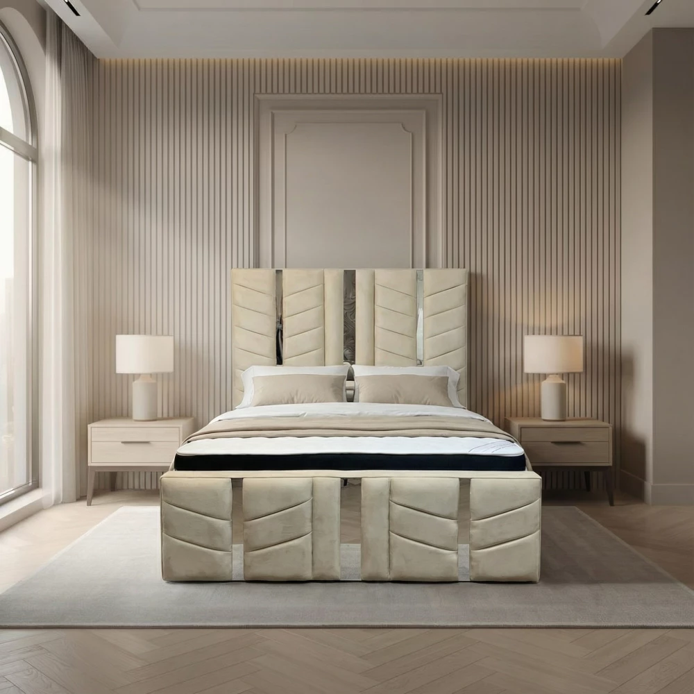 The Coppice Bed Frame – Modern Elegance RedefinedIntroducing The Coppice Bed Frame, a striking blend of refined craftsmanship and contemporary sophistication. Thoughtfully designed by Beds Craft, this luxurious bed frame is perfect for those who desire a bold, modern statement piece without compromising on comfort or functionality. Its unique panelled headboard and footboard, enhanced with sleek angles and optional mirror detailing, immediately elevate any bedroom.Key Features of The Coppice Bed FrameModern Panel DesignThe Coppice showcases a beautifully upholstered headboard and footboard featuring deep, sculpted panel sections. Accented with optional gold or silver mirror strip detailing, it brings dimension, glamour, and artistry into your space.Fits Any BedroomAvailable in all standard UK sizes—