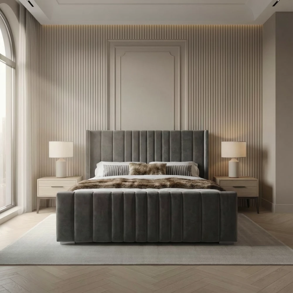 A Wingback Bed Frame Designed for Modern LuxuryWhat sets The Doppler Wingback Bed apart is its impressive vertical panel headboard, paired with a coordinating footboard to create a cohesive, sophisticated look. The clean, vertical lines deliver a perfect balance of minimalism and grandeur, making this bed an ideal choice for homeowners seeking a contemporary yet luxurious aesthetic.Luxury, Comfort & Practicality CombinedSink into the comfort of The Doppler Wingback Bed, crafted with both visual impact and everyday practicality in mind. Optional ottoman gas-lift storage provides a smart solution for keeping your bedroom clutter-free without compromising on style.More than just a bed, The Doppler Wingback Bed becomes an essential part of your lifestyle—beautifully tailored to your taste, built to last, and designed to transform your bedroom into a true sanctuary.