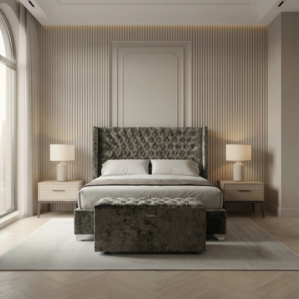 Choose between sparkling crystal accents or subtle colour-matched fabric buttons to enhance the Dorchester’s luxurious upholstery. With a curated palette of over 30 stunning colours and a selection of premium fabrics—including crushed velvet, Naples velvet, chenille, and plush velvet—you can tailor your bed to perfectly reflect your personal style and interior décor.Tailor-Made Wingback DesignThe Dorchester Wingback Bed isn’t just visually striking—it’s designed with everyday practicality in mind. Add the optional ottoman storage upgrade to transform this elegant bed into a smart storage solution. Using an easy-lift mechanism, the ottoman feature reveals generous under-bed storage space ideal for bedding, seasonal clothing, or other essentials, helping you maintain a tidy and beautifully organised bedroom.Every Dorchester Wingback Bed is customisable, allowing you to specify details such as fabric type, colour, button style, height adjustments, and more—ensuring a perfect match for your room and personal tastes. This is furniture made for you.Built for a Lifetime of LuxuryCrafted with durability at its core, The Dorchester Wingback Bed is built from solid wood for long-lasting strength and stability. The frame is supported by robust wooden slats and a central support system, providing excellent mattress support and ensuring night-after-night comfort.A Bed Designed for Those Who Expect MoreThe Dorchester Wingback Bed is more than a piece of furniture—it’s a statement of luxury, functionality, and timeless design. Whether you seek bold glamour or subtle sophistication, this bespoke wingback bed delivers a truly elevated sleeping experience.Transform your bedroom with The Dorchester Wingback Bed—where luxury, comfort, and craftsmanship come together in perfect harmony.