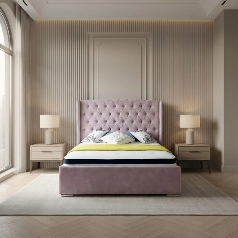 The Mayfair Wingback Bed – Luxury Wingback Bed FrameIntroducing The Mayfair Wingback Bed, a refined fusion of classic Chesterfield charm and modern design. Featuring a beautifully sculpted wingback headboard with a distinctive, sweeping curve, this elegant bed frame brings a commanding presence to any bedroom. Its deep, hand-tufted upholstery and premium fabric choices make it a true showpiece.Crafted with meticulous attention to detail, the Mayfair Wingback Bed is available in a wide selection of luxurious fabrics — including plush velvet, chenille, crushed velvet, and our contemporary fabric ranges. Whether you prefer subtle tones or bold statement colours, the Mayfair is designed to seamlessly complement your interior style.Chesterfield Wingback Bed DesignThe Mayfair’s grand wingback headboard features a classic Chesterfield pattern that flows gracefully over the top, adding depth, texture, and sophistication. Choose between sparkling diamanté studs for a glamorous finish or matching fabric buttons for a more understated, elegant look.Available in All UK SizesThe Mayfair Wingback Bed is offered in all standard UK sizes: