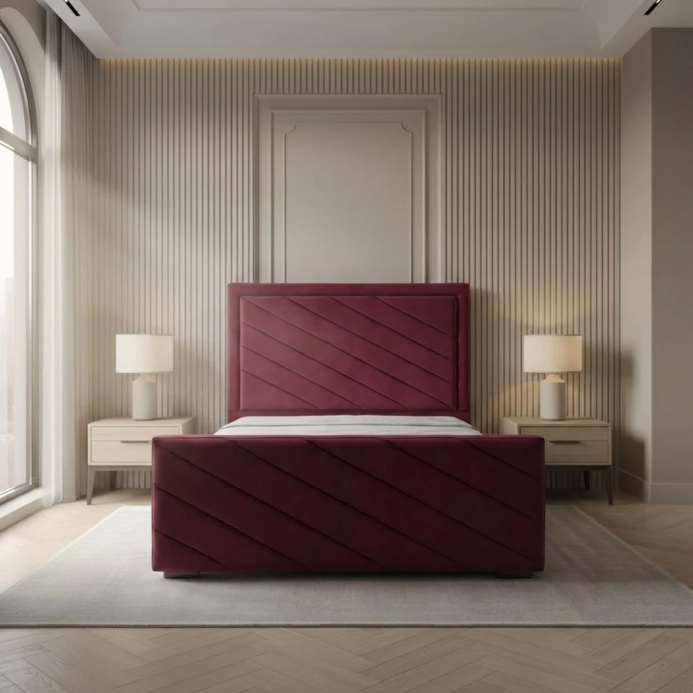 The Memphis stands out with its beautifully upholstered headboard and footboard, each featuring elegant diagonal paneling framed within a sleek bumper-edge design. This combination adds depth, texture, and a distinctive architectural look to your bedroom.Perfect for Any Space