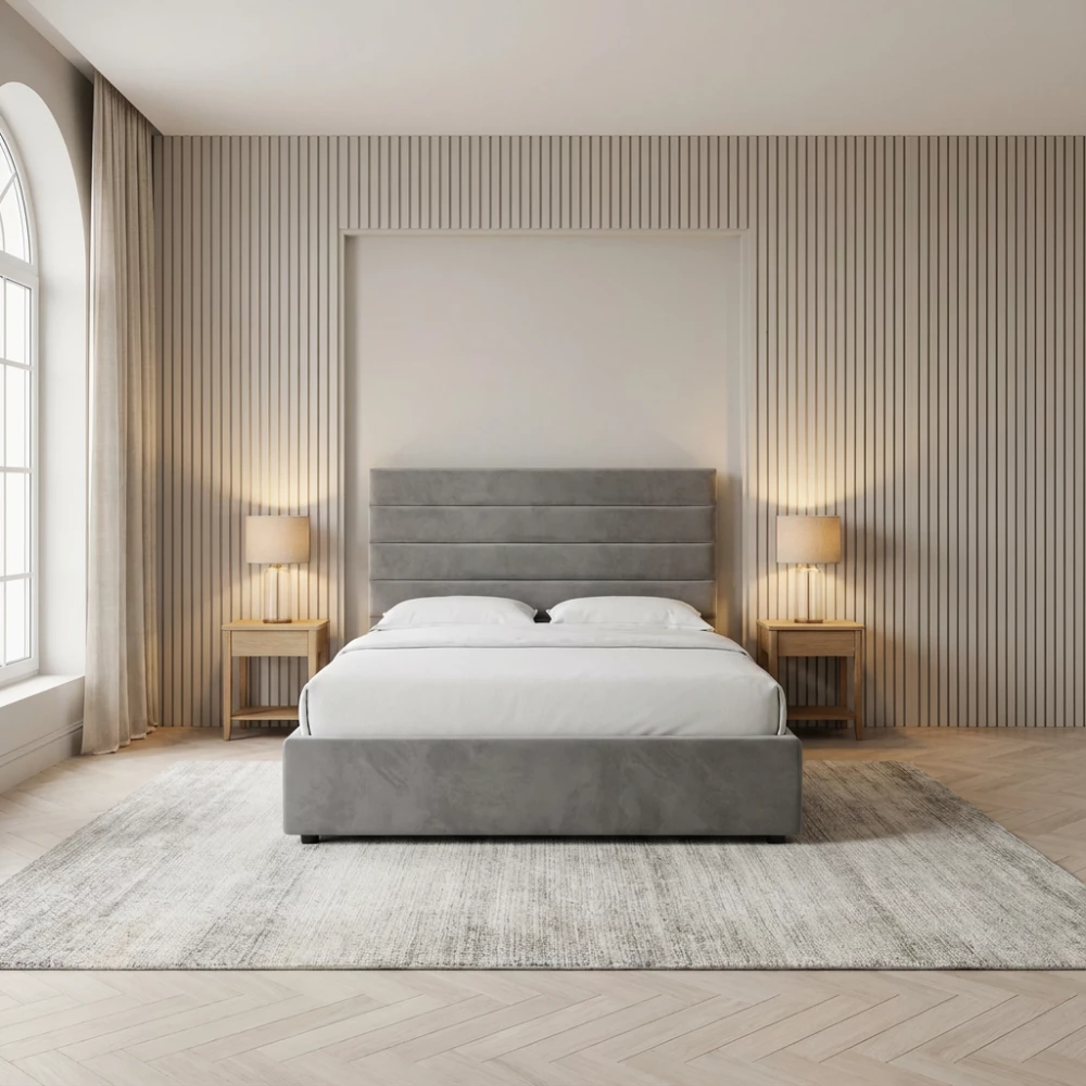 Experience contemporary elegance at its finest with The Quattro Fabric Designer Bed, a standout addition to our bespoke designer collection. Crafted with precision and inspired by cutting-edge interior trends, this bed brings together exceptional comfort and striking modern design to transform your bedroom into a sophisticated retreat.The Quattro features a tall, statement headboard paired with a sleek low foot end—one of the most in-demand styles seen across today’s premium bedroom showrooms. Its clean horizontal panel detailing and bold fabric choices create an effortlessly refined look, making The Quattro is the perfect centrepiece for any modern home.Designer Bed with Optional Ottoman StorageBeyond its visual appeal, The Quattro Fabric Designer Bed is built with durability in mind. Each frame is handcrafted from solid wood and reinforced with strong wooden slats and central support, providing long-lasting stability and exceptional mattress support.Personalisation is at the heart of every Quattro bed. Choose from an extensive range of premium fabrics—including plush velvet, chenille, crushed velvet, and Naples velvet—to curate a look that suits your style. With over 30 beautiful colour options, you can design a bed that blends harmoniously with any décor.Superior Design. Bespoke Comfort. Timeless Style.The Quattro Fabric Designer Bed is more than furniture—it’s a reflection of your individuality, your taste for quality, and your commitment to modern luxury. Whether you’re refreshing your room or completing a full makeover, this designer bed elevates your space with elegance, comfort, and impeccable craftsmanship.Transform your bedroom with The Quattro Fabric Designer Bed and enjoy a beautifully modern sanctuary designed just for you.