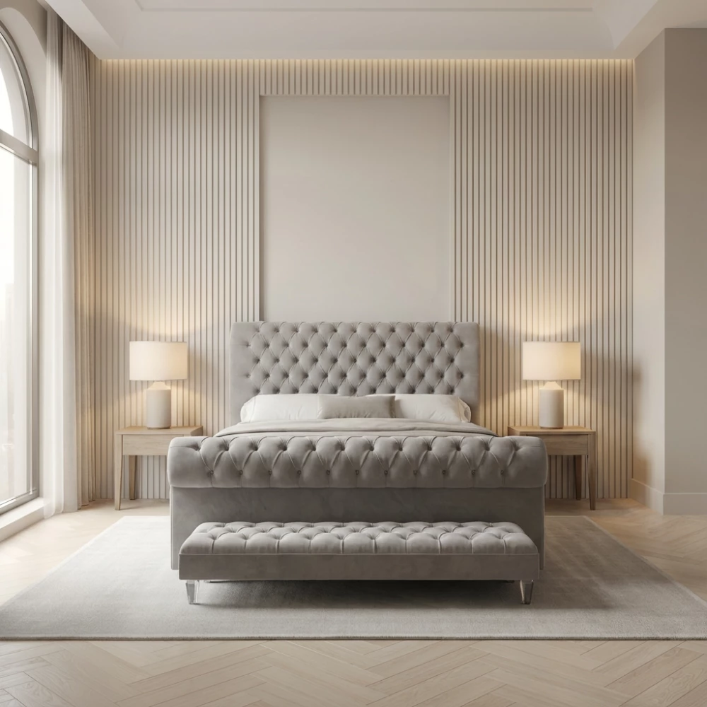 The Quebec Chesterfield Sleigh Bed – Timeless Luxury Meets Modern ComfortIndulge in the perfect blend of classic elegance and contemporary craftsmanship with The Quebec Chesterfield Sleigh Bed. Handcrafted in Britain, this beautifully designed sleigh-style bed elevates the traditional Chesterfield look into a luxurious centrepiece for any bedroom.A Classic Chesterfield, ReimaginedThe Quebec features a stunning hand-tufted Chesterfield headboard and footboard, showcasing deep buttoning and graceful curves that create the iconic sleigh silhouette. Its elegant profile transforms your room into a space of refined style and enduring sophistication.Premium Fabric Choices – Crushed Velvet, Plush Velvet & MoreChoose from an extensive selection of luxury fabrics, including: