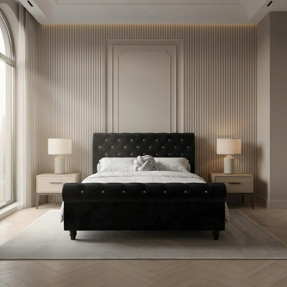 The Regal Sleigh Bed – Best Selling Sleigh BedsExperience the perfect blend of luxury, comfort, and timeless charm with The Regal Sleigh Bed. Designed to elevate any bedroom, this beautifully sculpted sleigh bed brings classic elegance together with modern, handcrafted quality—creating a centrepiece that truly stands out.A favourite among our luxury bed collection, The Regal features the iconic scroll-top silhouette on both the headboard and footboard, capturing the traditional essence of a sleigh bed. Its grand headboard is finished in a hand-crafted Chesterfield design, complete with your choice of shimmering diamante crystals or matching fabric buttons for a softer, understated look.Crushed Velvet, Plush Velvet or Chenille – Tailored to Your StyleAt Beds Craft, personalisation is key. The Regal Sleigh Bed is available in over 30 stunning colourways and a selection of premium fabrics such as crushed velvet, plush velvet, chenille, or Naples velvet. Whether you're aiming for a bold statement or a subtle, elegant finish, your bed can be customised to perfectly complement your interior.Crafted for Strength & LongevityEvery Regal Sleigh Bed is built using a solid wooden frame—crafted to provide exceptional durability year after year. Sturdy wooden slats and a reinforced middle support ensure optimal mattress support, enhancing comfort while extending the life of your mattress.Sleigh Bed with Ottoman Storage OptionFor added practicality, the Regal is also available with an ottoman gas-lift storage option. This under-bed storage solution offers generous hidden space, perfect for keeping your bedroom organised without compromising on style.Available in All UK SizesChoose from: