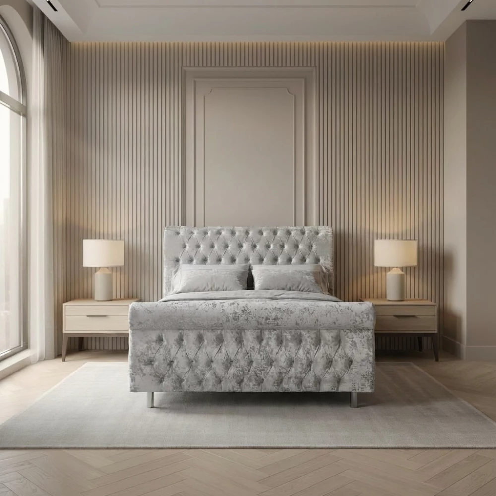 Experience Luxury Sleigh Beds With The Swan Sleigh BedIntroducing The Swan Sleigh Bed—a true symbol of elegance, sophistication, and refined craftsmanship. Inspired by the graceful curves of a traditional sleigh silhouette, this bed’s beautifully arched headboard and footboard bring a touch of timeless charm to any bedroom.Handcrafted with meticulous attention to detail, The Swan Sleigh Bed features exquisite Chesterfield upholstery across both the headboard and footboard. This classic deep-buttoned design not only enhances its luxurious appearance but also provides superior comfort and support, creating the perfect backdrop for a peaceful night’s rest.With over 30 stunning colour options available, you can effortlessly match this bed to any interior décor, from contemporary chic to traditional opulence.Bespoke Fabrics & Finishing DetailsCustomise The Swan Sleigh Bed to perfectly reflect your personal style. Choose from a selection of premium fabrics, including: